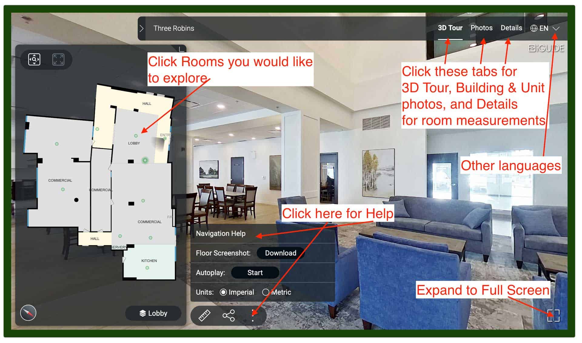 View photos or take a virtual walkthrough of our show suites, amenities, and community life at Three Robins Riverside.